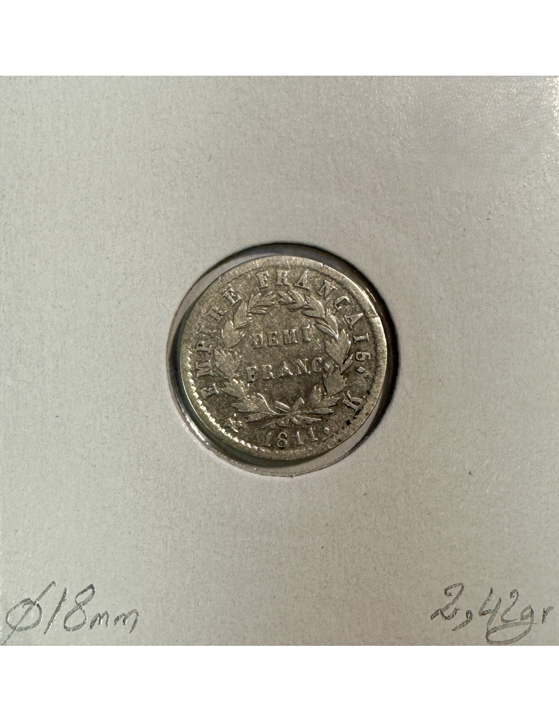 Pièce de monnaie en argent d'un demi Franc 1808 A représentant Napoléon empereur au Revers République