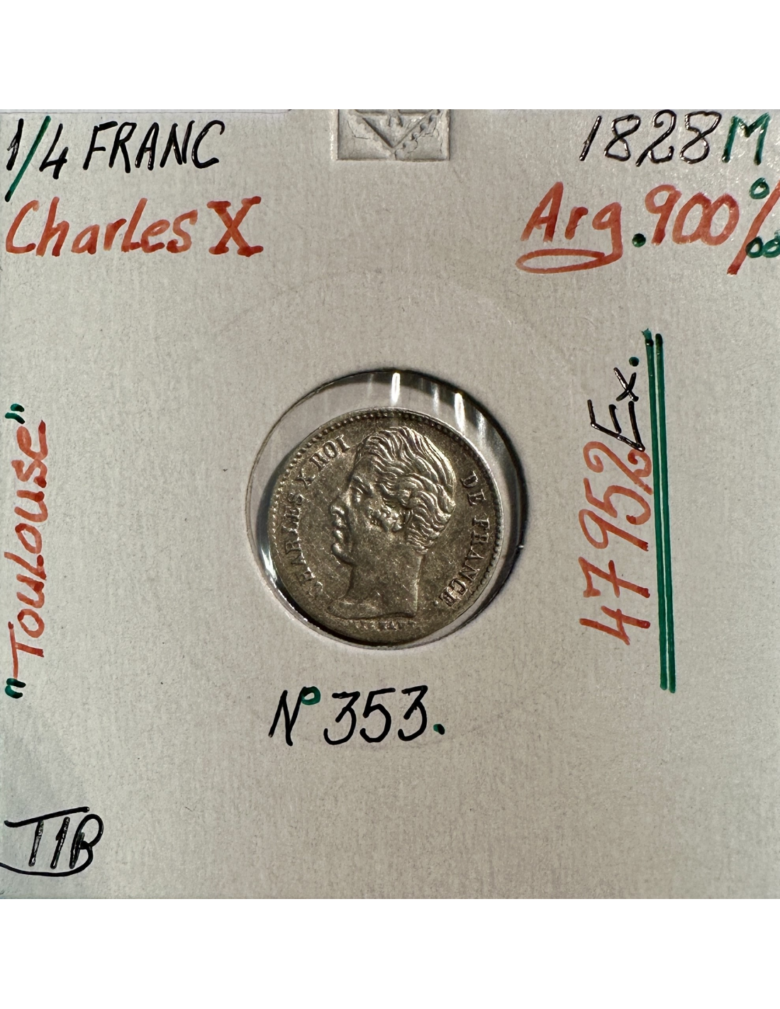 Pièce de monnaie en argent de 1/4 Franc Charles X 1829 A, Atelier de Paris