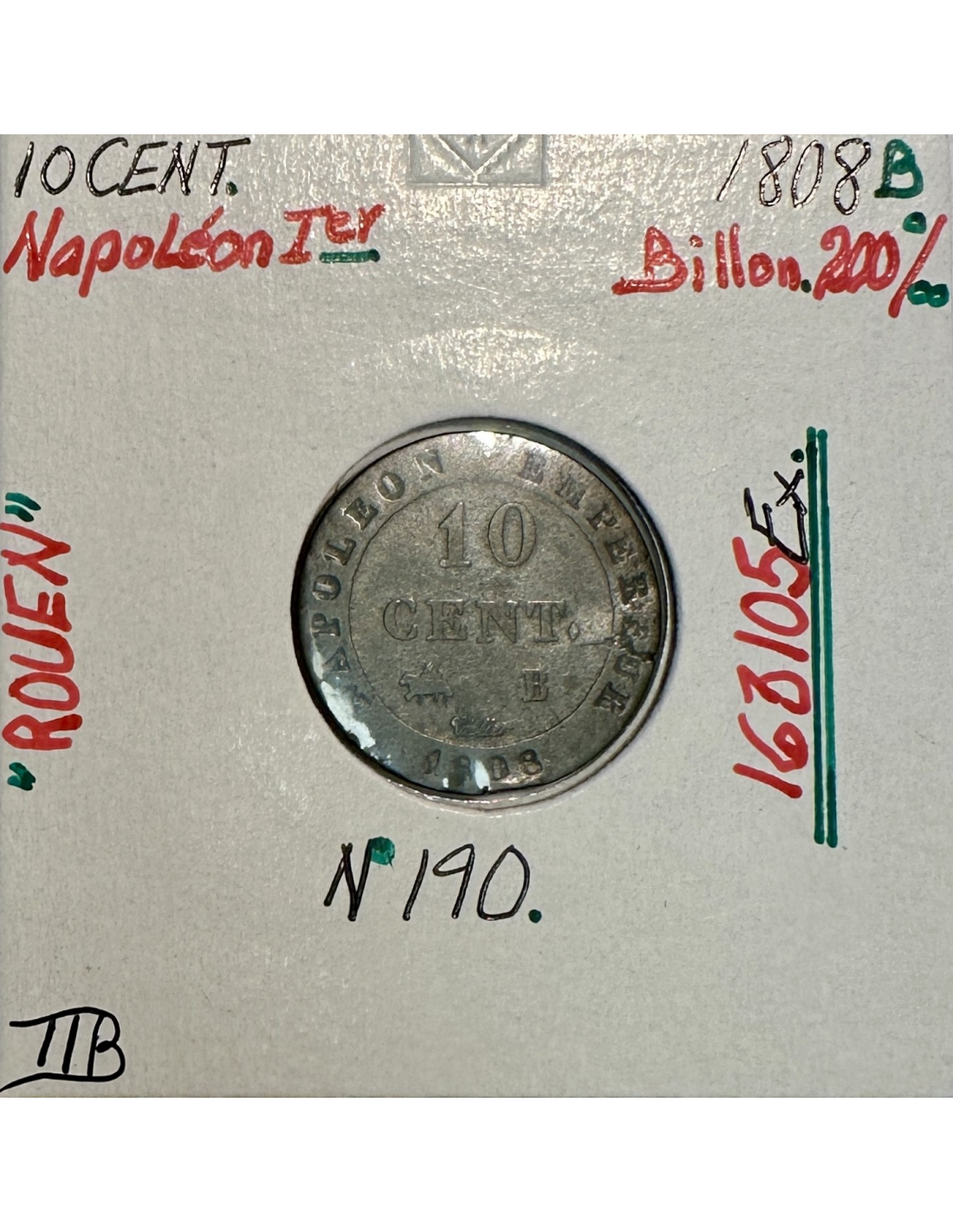 Pièce de monnaie de 10 centimes Napoléon Ier en Billon, 10 Cent 1808B, Atelier de Rouen en état TTB