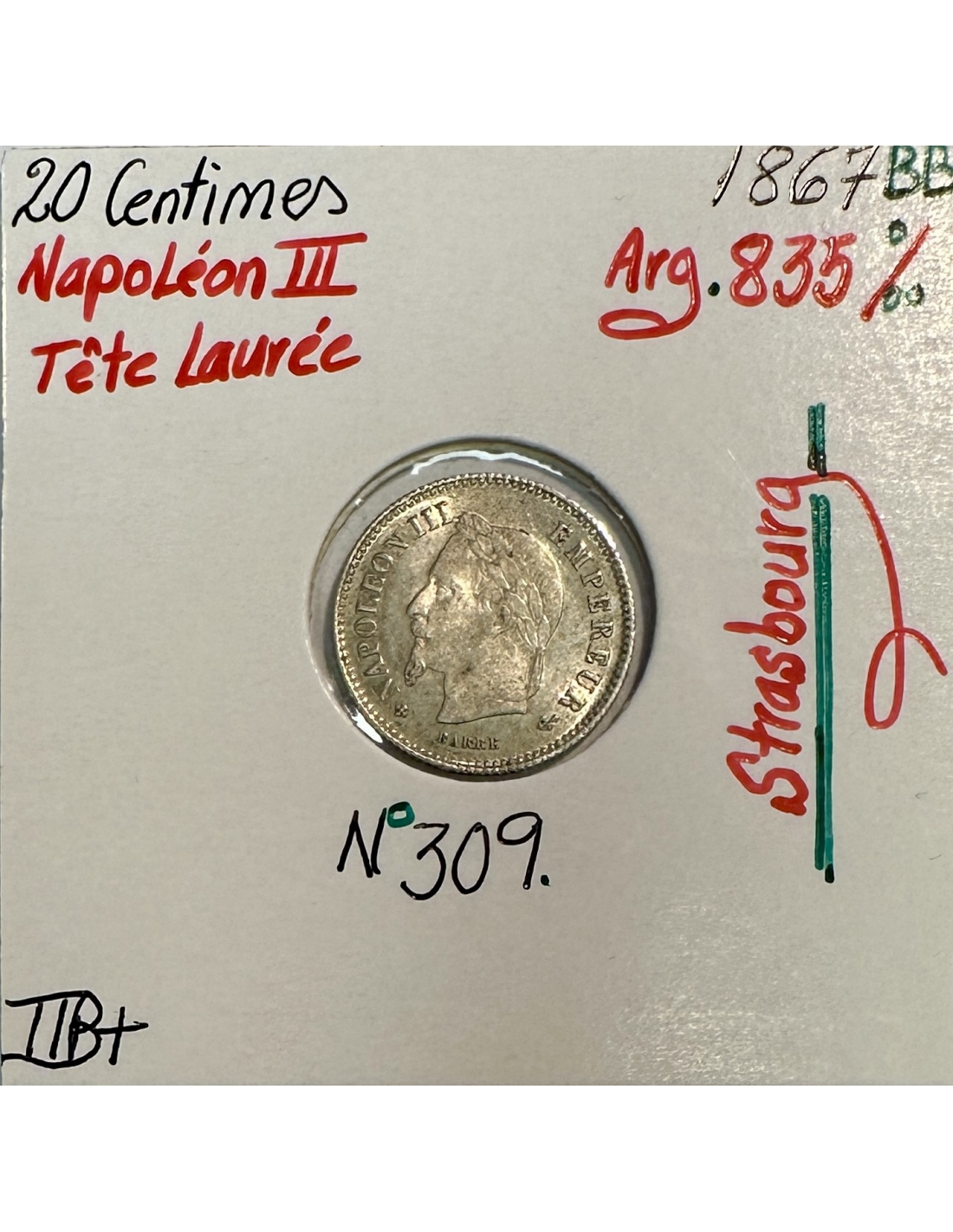 Pièce de monnaie en Argent de 20 Centimes Napoléon III 1859A, tête nue
