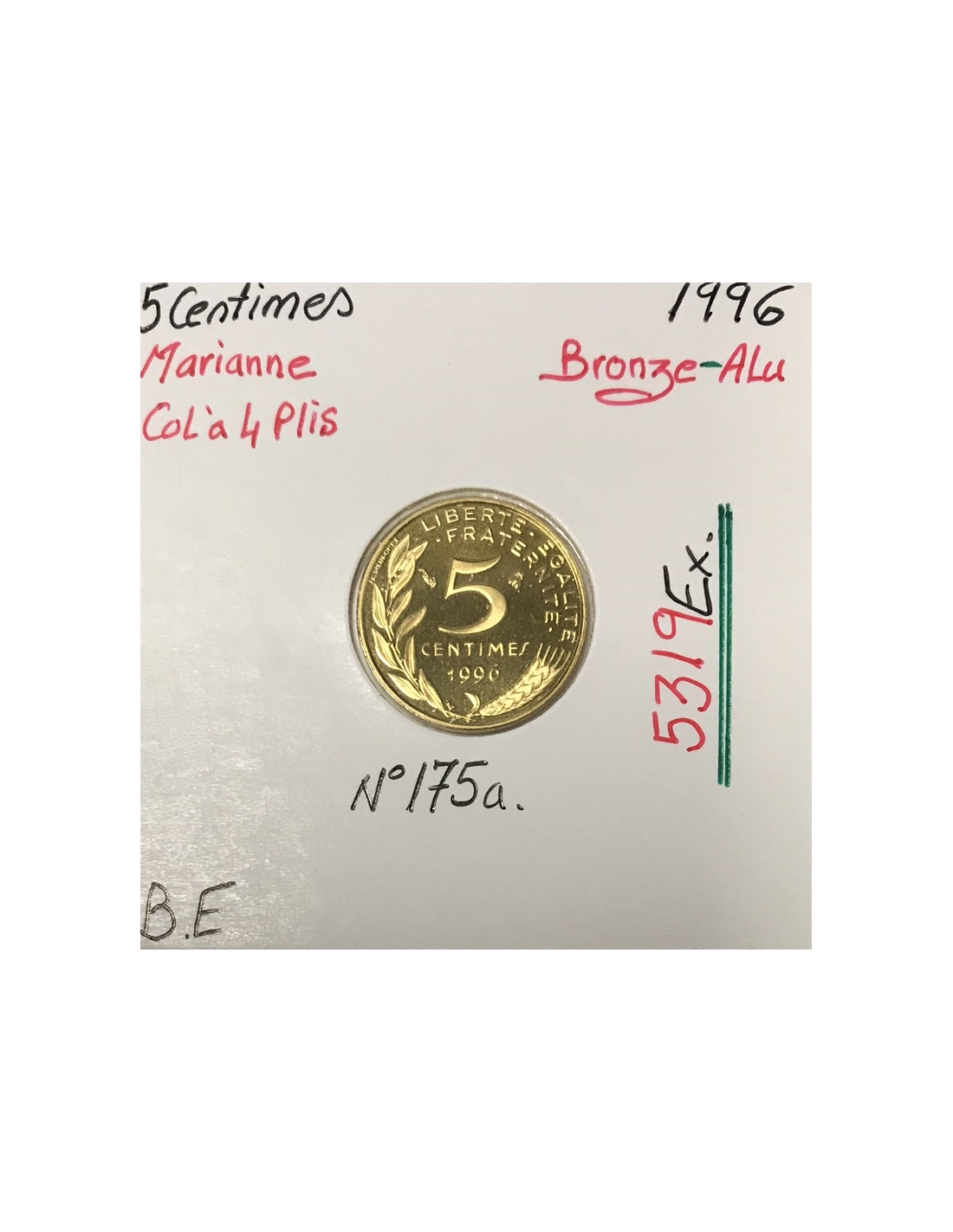 Pièce de monnaie de 5 Centimes Marianne 1996 avec Col à 4 Plis