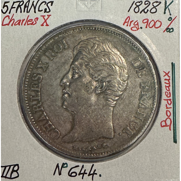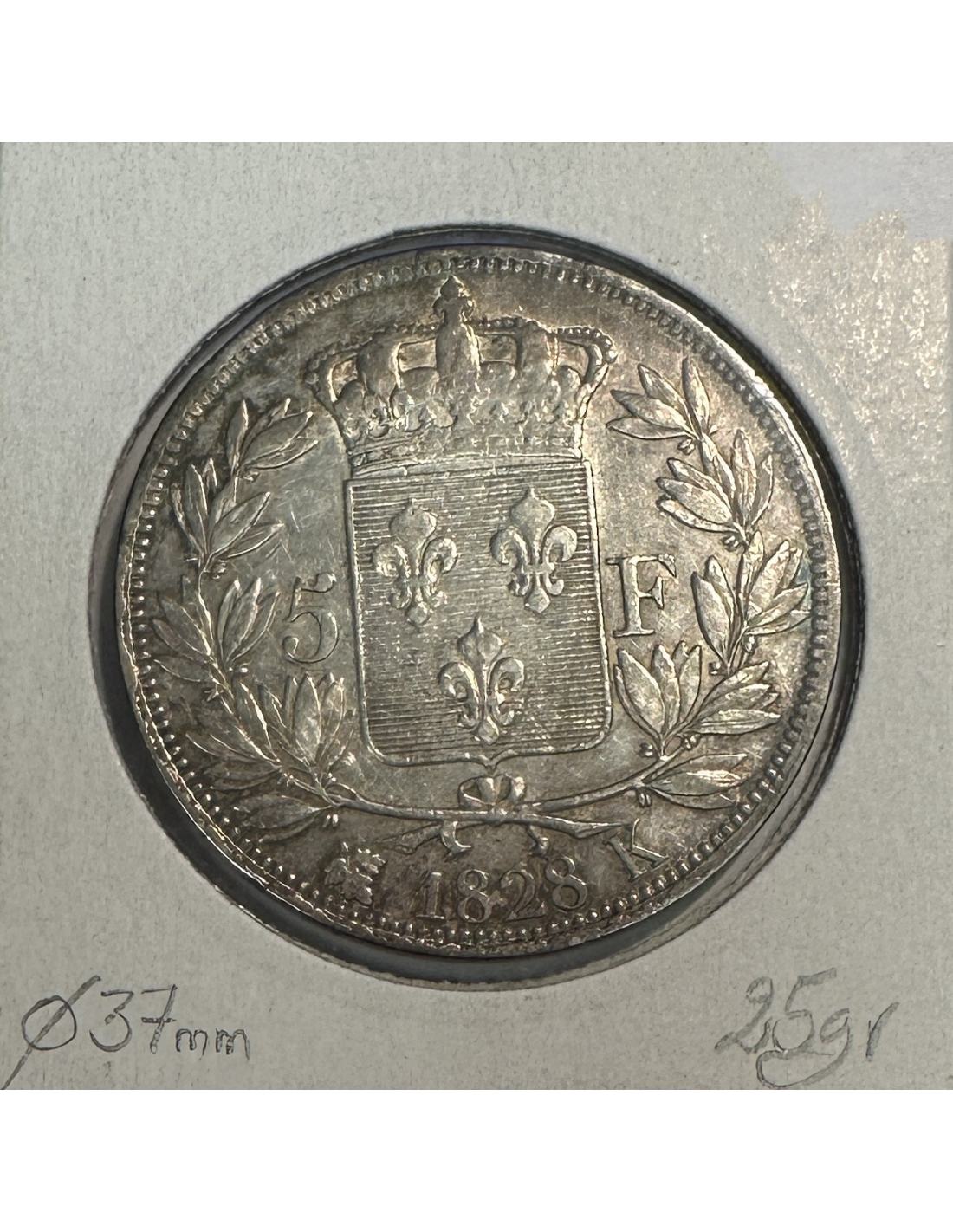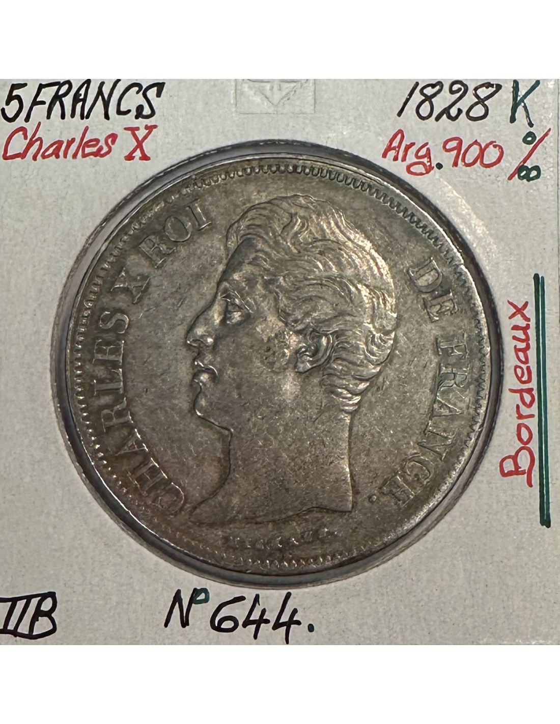 Pièce de monnaie en argent de 5 Francs Charles X, 1828K, Atelier de Bordeaux
