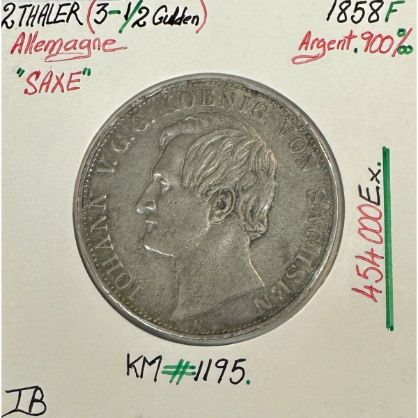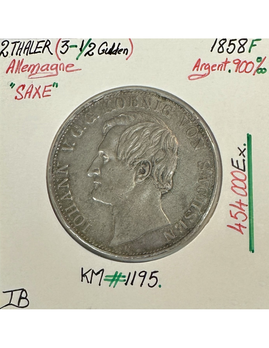 Pièce de monnaie allemande de la Saxe en Argent de 2 THALER 1858 F (3-1/2 GULDEN), à l'effigie de Jean V