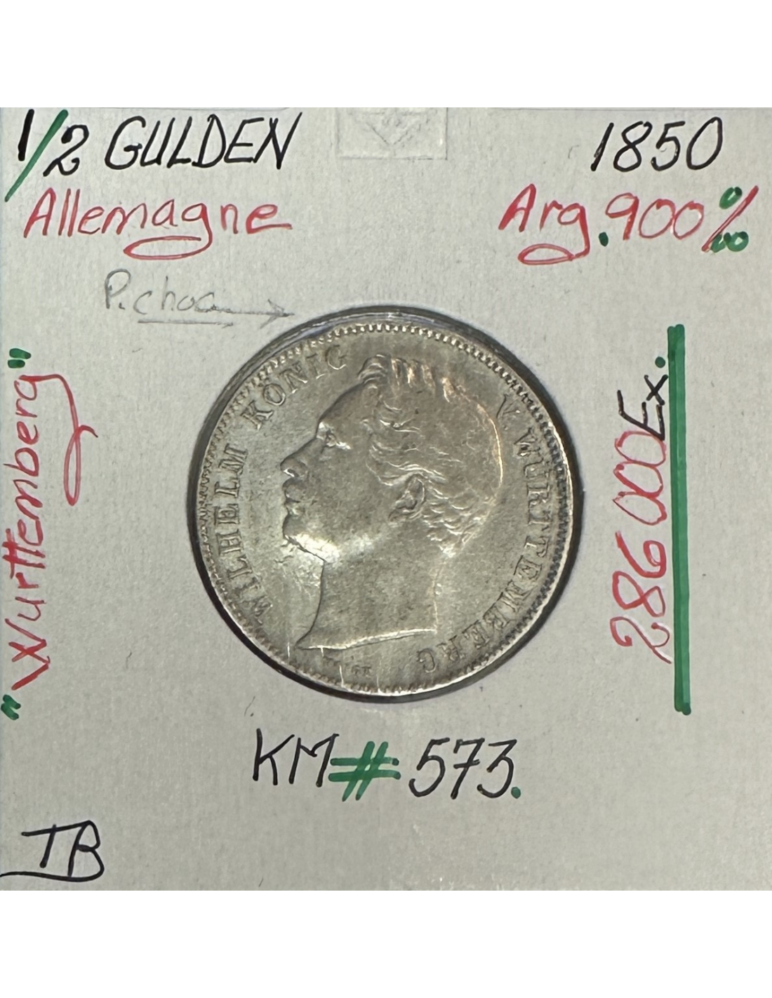 Pièce de monnaie allemande (Wuttemberg) en Argent de 1/2 Gulden 1850