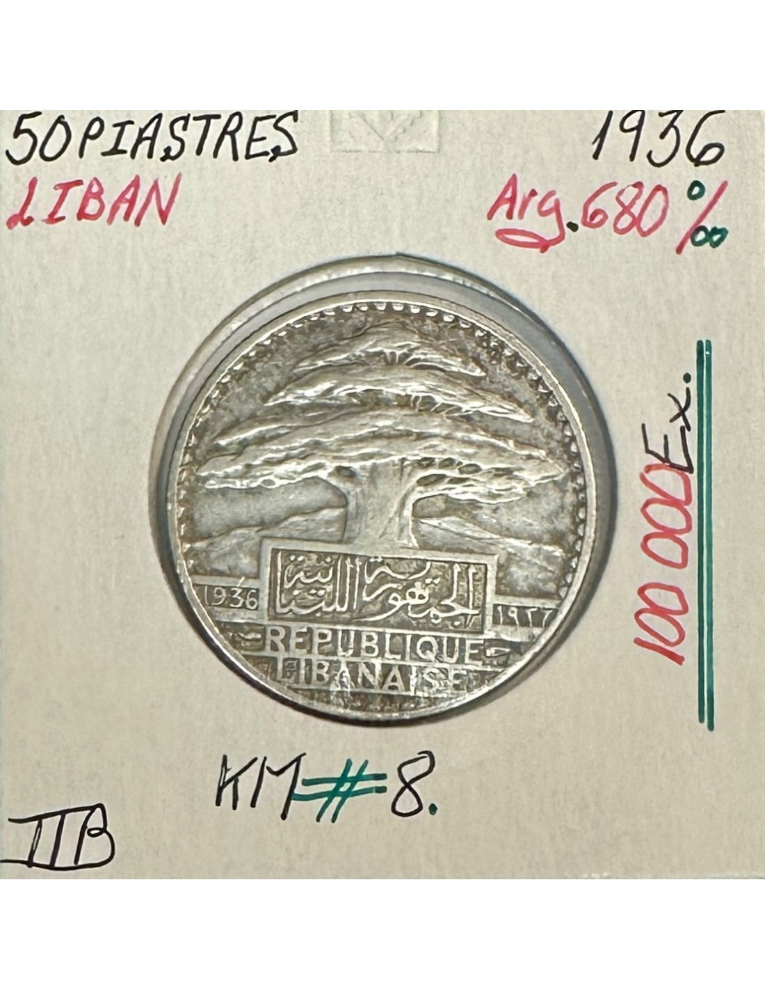 Pièce de monnaie en argent du Liban de 50 Piastres 1936, le Cèdre du Liban