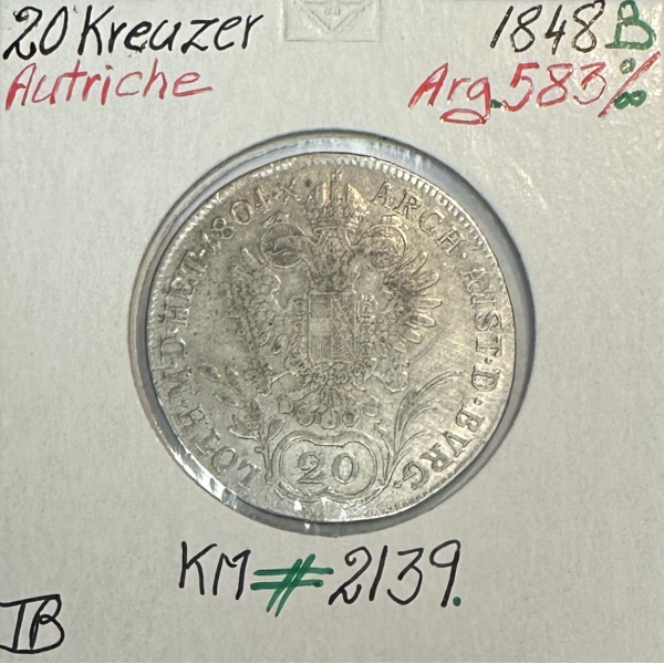 Pièce de monnaie d'Autriche en argent de 20 Kreuzer 1848 B