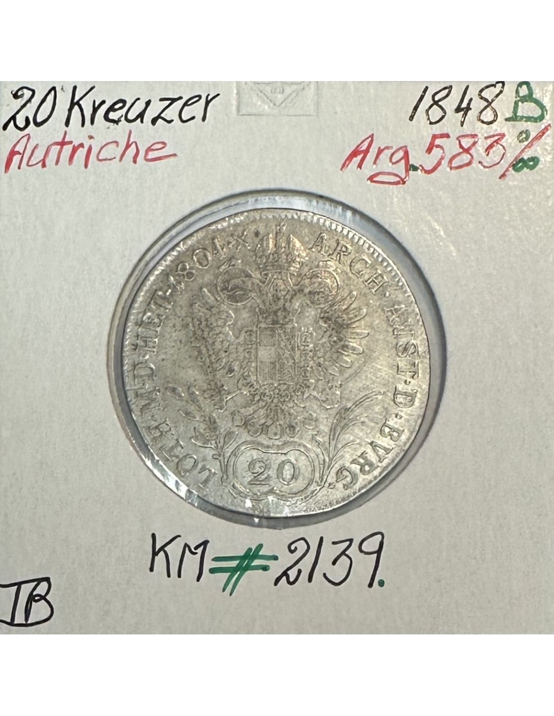 AUTRICHE - 20 KREUZER 1848 B - Pièce de Monnaie en Argent // Qualité : TB