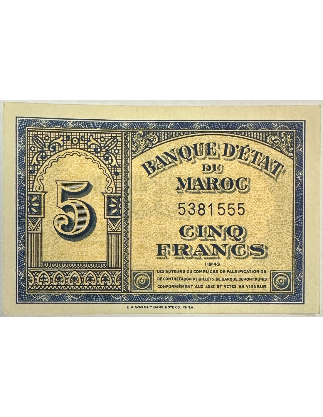 Billet de banque de la Banque d'Etat du Maroc de 5 Francs 1943, N° 5381555