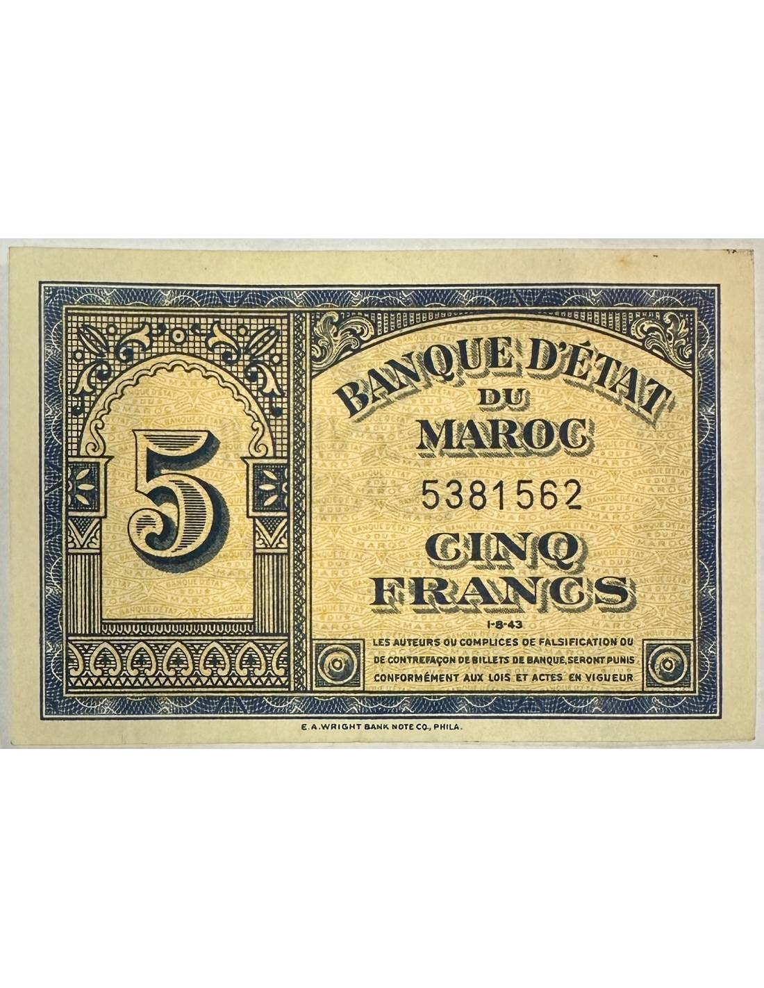 Billet de banque de la Banque d'Etat du Maroc de 5 Francs 1943, N° 5381561
