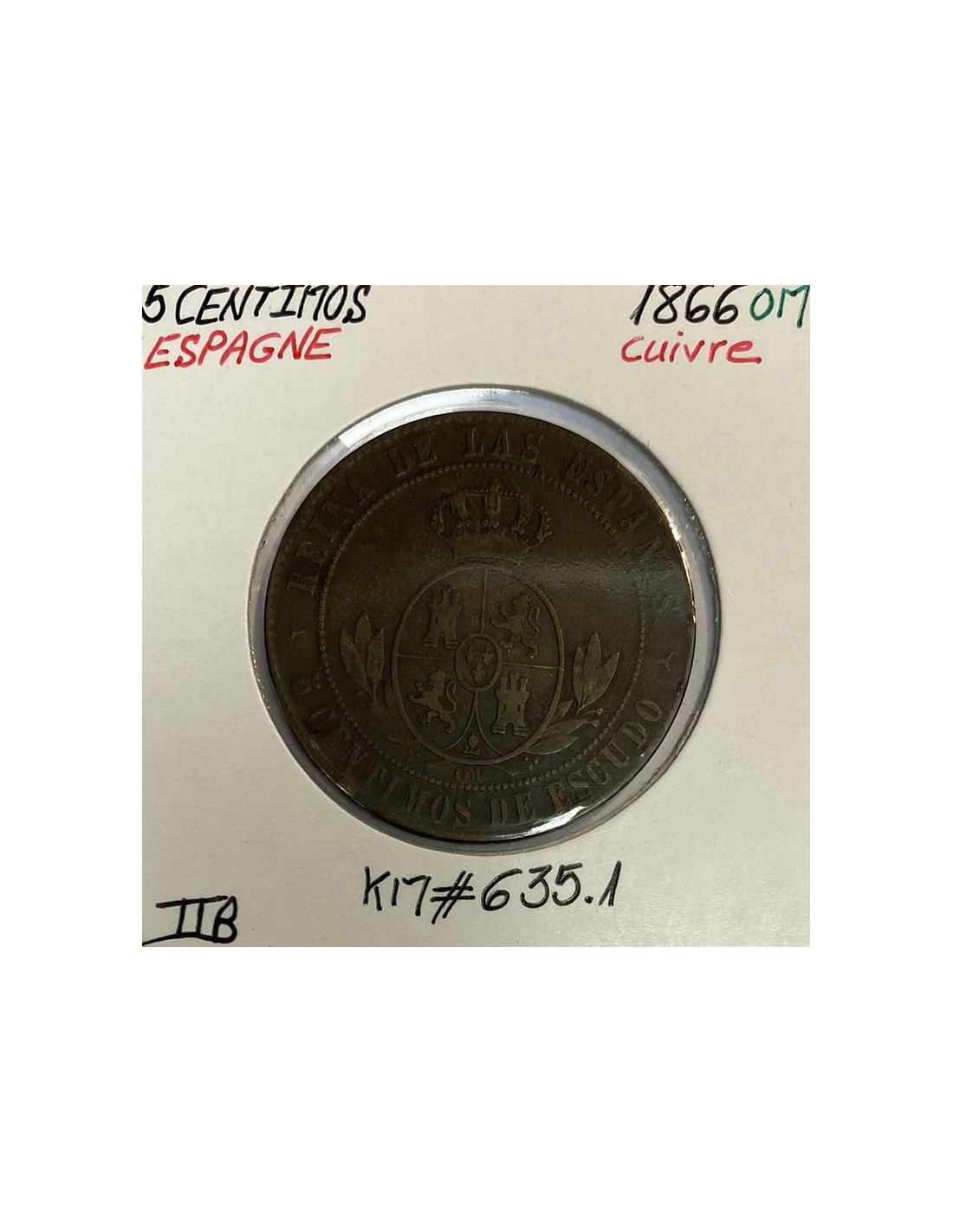 Pièce de monnaie espagnole en argent de 1 Pesetas 1869