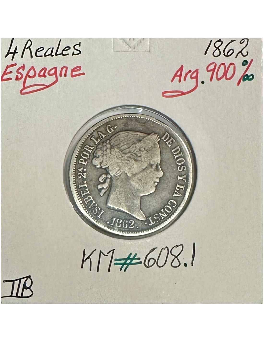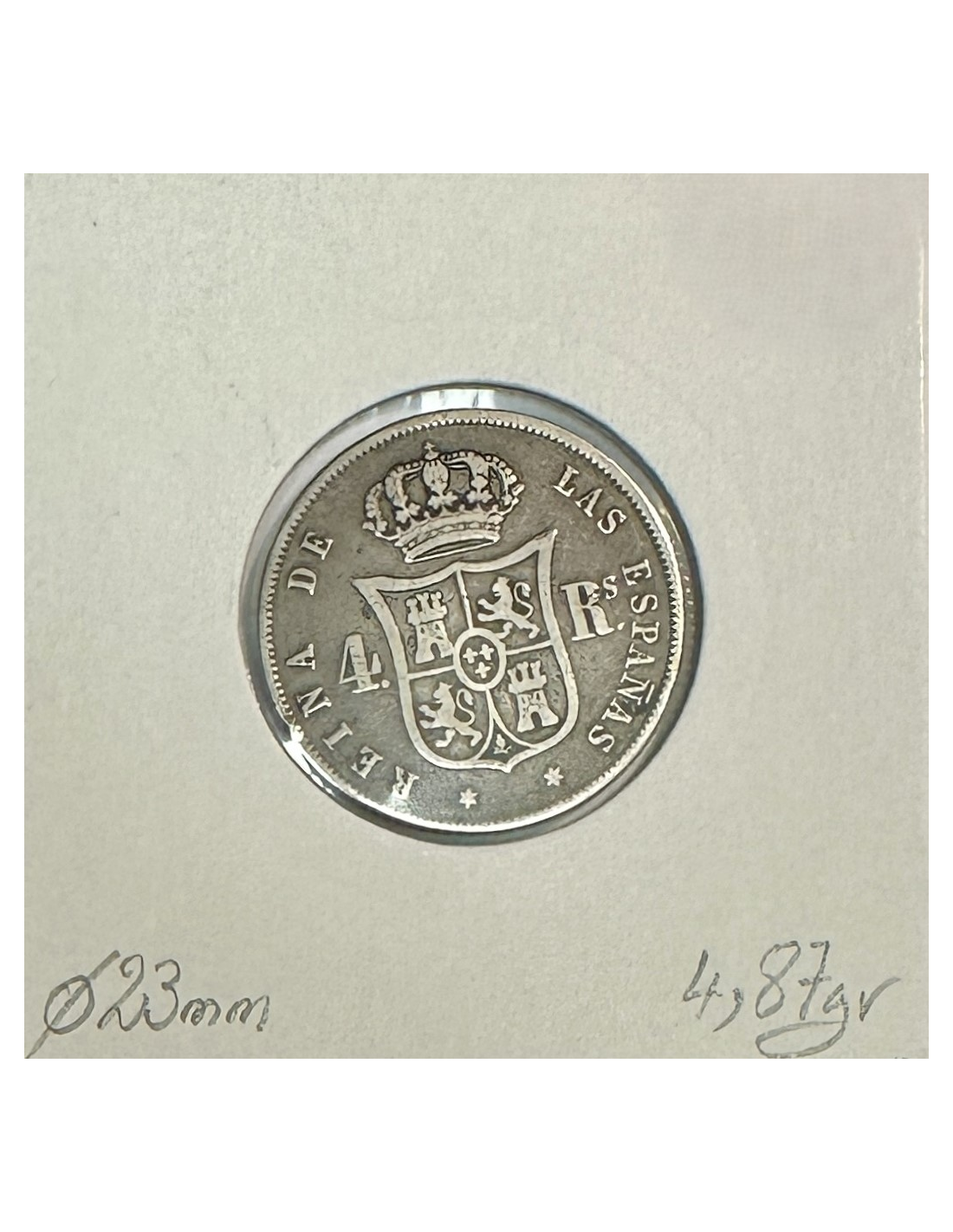 Pièce de monnaie espagnole en argent de 4 Reales 1858