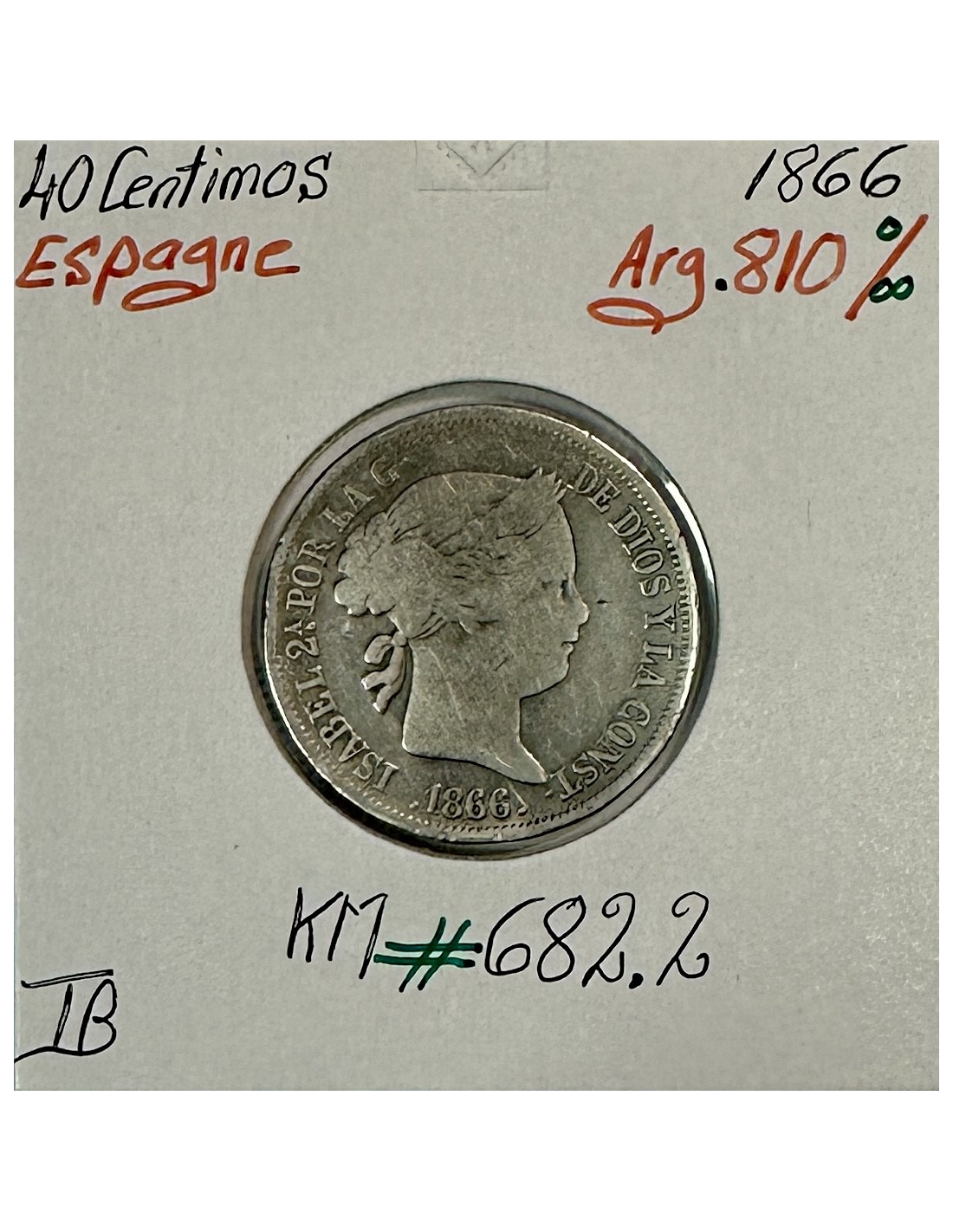 Pièce de monnaie espagnole en argent de 1 Pesetas 1869