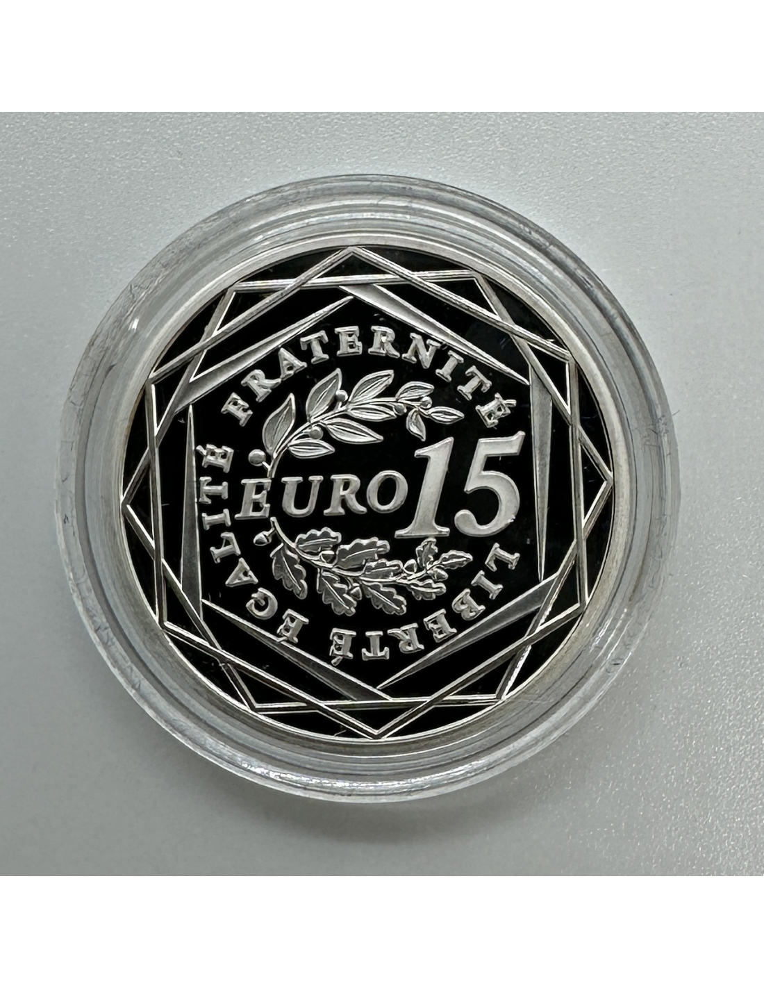 Pièce de 15 Euro 2008 en Argent de la France représentant la Semeuse en qualité Belle Epreuve, présentée sous capsule d'origine et issue du coffret BE