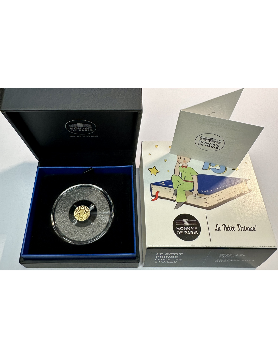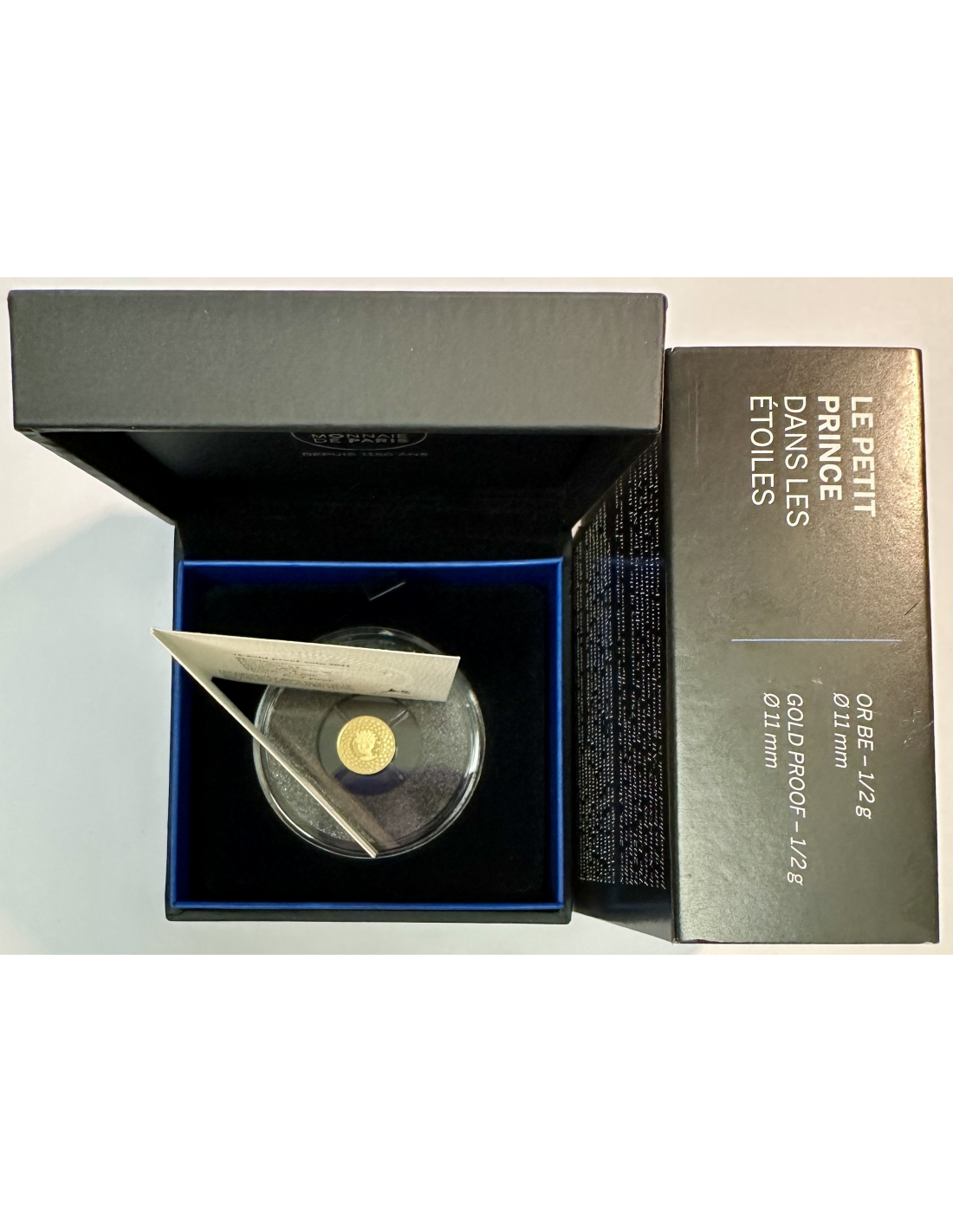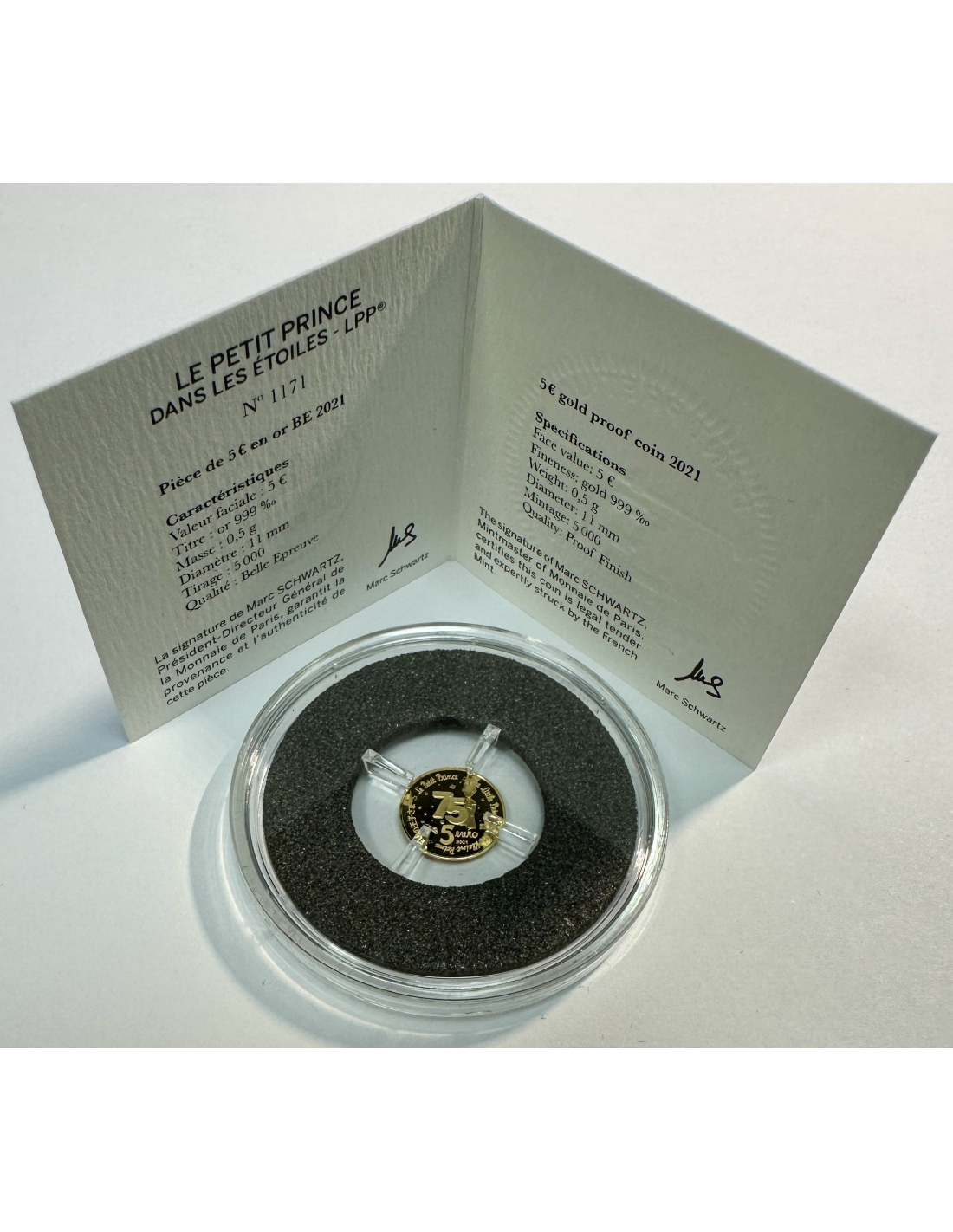 Pièce de 5 Euro 2021 en OR de la France en Coffret BE, émis par la Monnaie de Paris, commémorant le 75ème anniversaire du Petit Prince, dans les étoiles