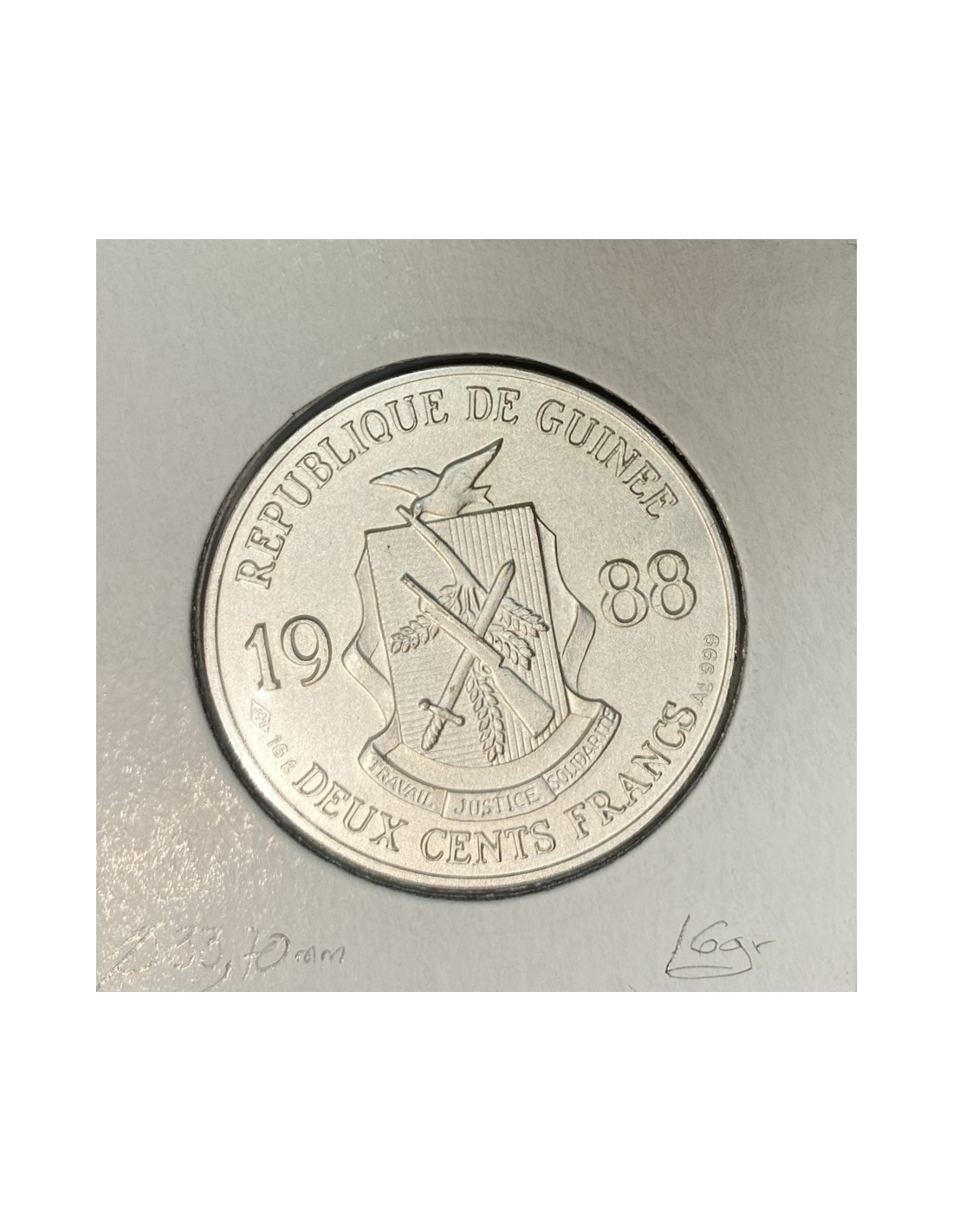 Pièce de monnaie en argent de la Guinée de 200 Francs 1988