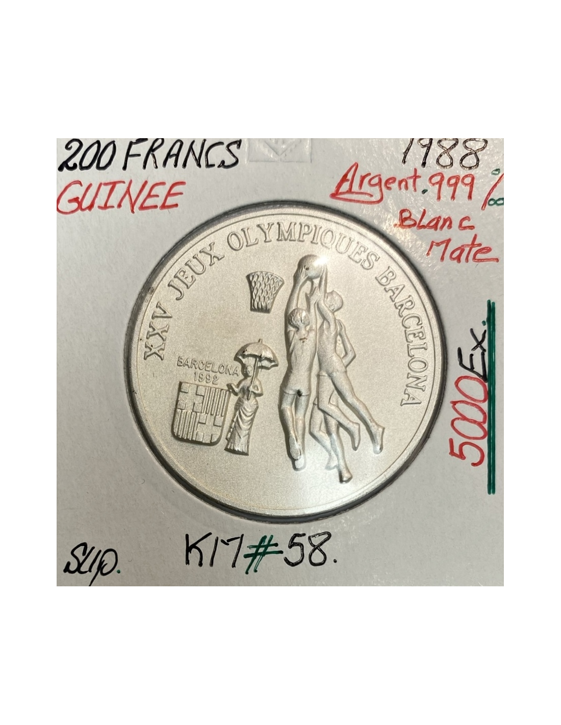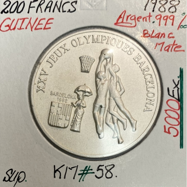 Pièce de monnaie en argent de la Guinée de 200 Francs 1988 commémorant les XXV Jeux Olympiques de Barcelone, le Basket