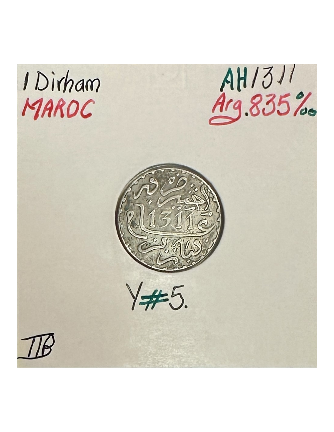 Pièce de monnaie en argent du Maroc de 1 Dirham, datant de l'année 1313 de l'Hégire