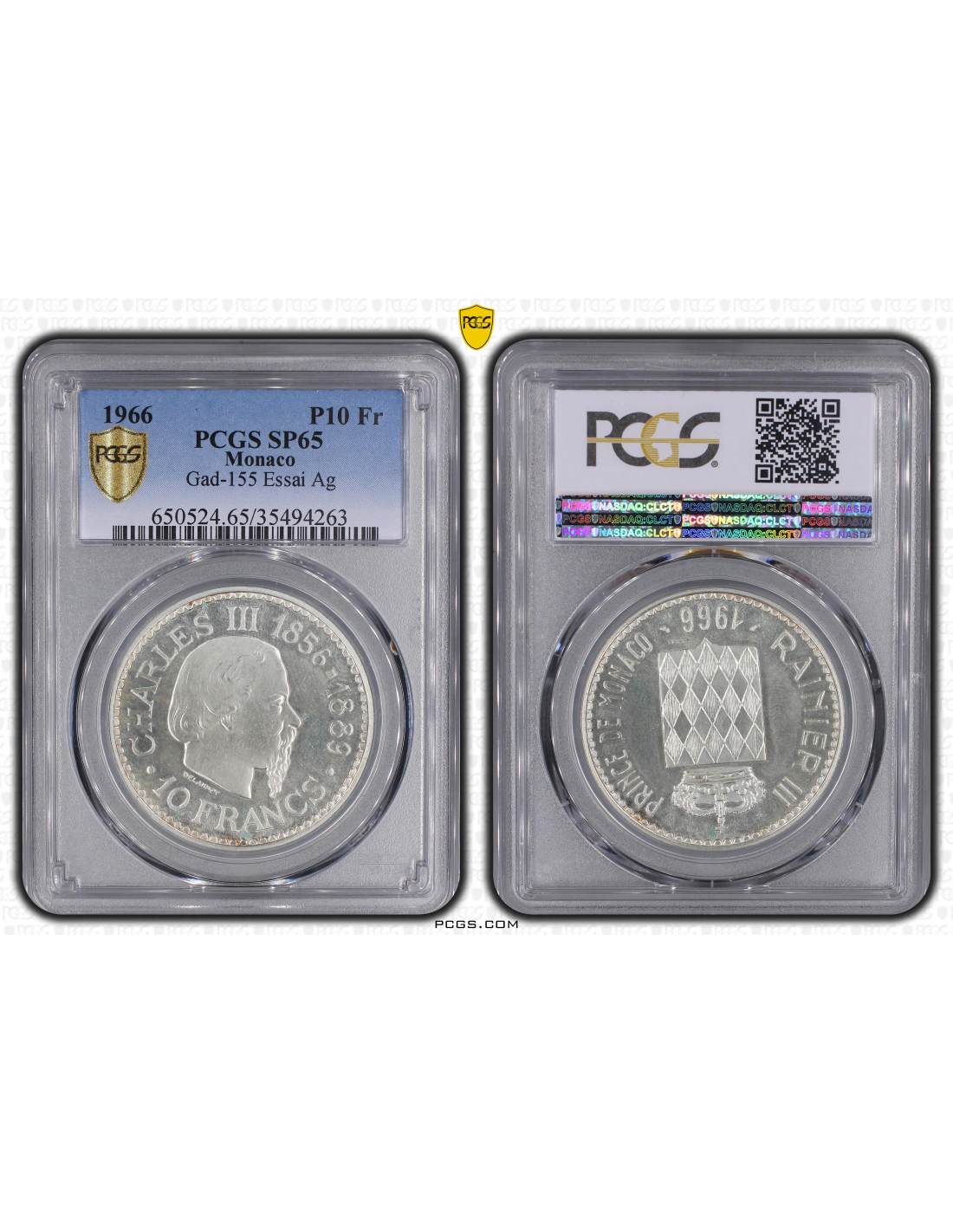 MONACO - 10 FRANCS 1966 (Charles III) Monnaie en Argent certifiée PCGS // ESSAI