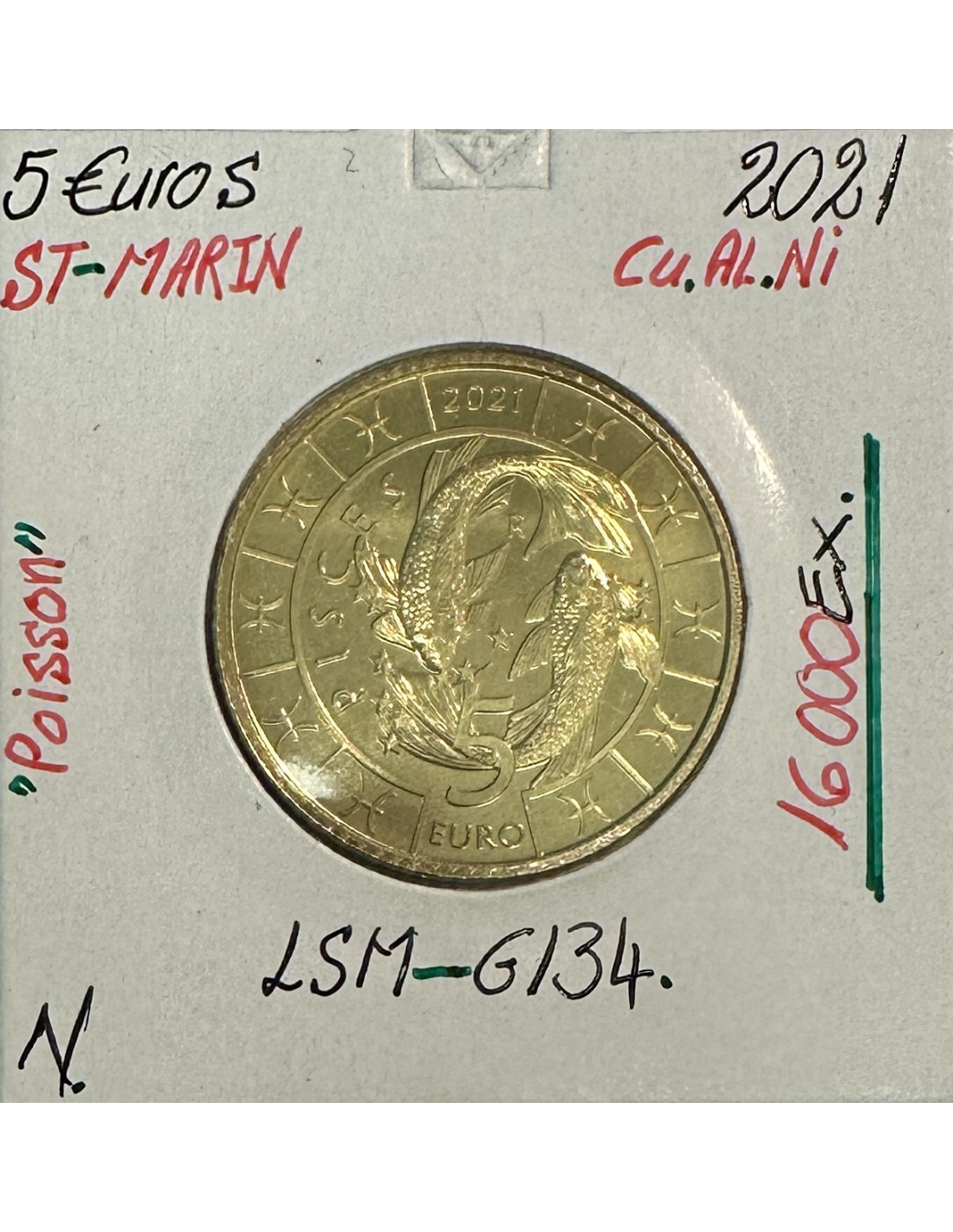 Pièce de monnaie commémorative en Cuivre.Alu.Nickel de 5 Euro 2021 de Saint-Marin (Poisson)